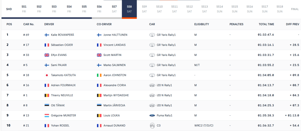 Los Hyundai rodaron a un ritmo más parejo. Adrien Fourmaux, el que más comodidad siente sobre su i20 N, mantiene su objetivo de no perder el contacto ni con Takamoto ni con Sami: «La diferencia es grande, pero lo estoy haciendo lo mejor que puedo». El #16 pudo recortar unas décimas al japonés, aunque no al nórdico. Thierry Neuville y Ott Tänak permanecen en el séptima y octavo lugar, respectivamente. Todavía lamentan el mal balance de sus coches.