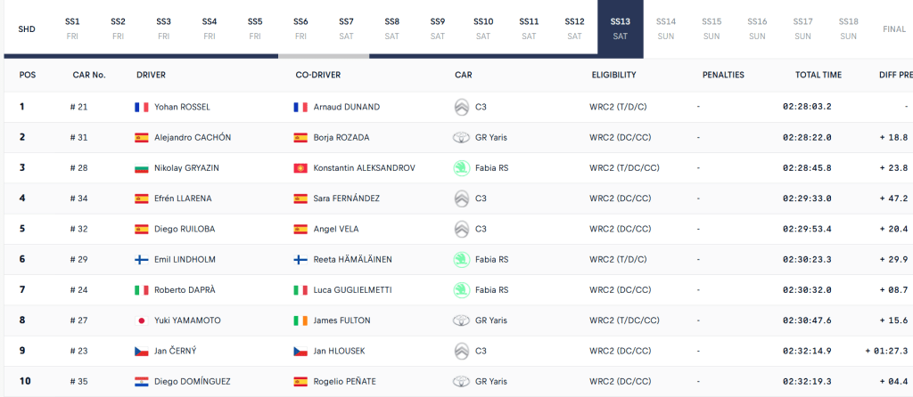 Yohan Rossel mantiene el control de WRC2. El piloto oficial de Citroën Racing sigue al frente de la clasificación de la división de plata. Ya no gana todos los tramos, pero conserva 18.8″ de margen sobre su rival más próximo, el español Alejandro Cachón. La presencia de figuras nacionales en el top cinco no se reduce al actual campeón del Supercampeonato de España de Rallies (S-CER), ya que gay otros dos portadores de la rojigualda en las plazas de cabeza.