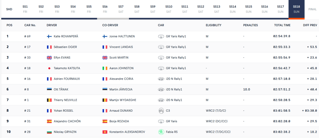 Sébastien Ogier tampoco pudo con su compañero en la cronometrada de bonificación. Solo un scratch se lleva el octocampeón de su visita a la isla de Gran Canaria. «Es el único que ha estado impresionante», admitió sobre la actuación de Kalle. El francés, además de asegurar su segunda plaza en la general, firmó otra P2 en la tabla dominical, en la que superó a Elfyn Evans por la mínima. El galés es más líder del certamen. Su ventaja ya va por los 43 puntos.