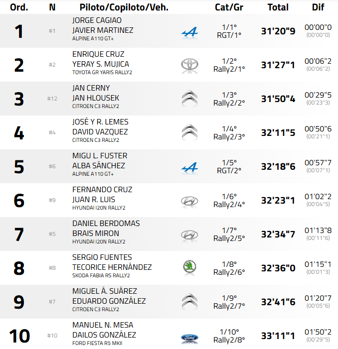 Miguel Fuster completa el top cinco con un Alpine A110 GT+ que comienza a entender, toda vez que Fernando Cruz marcha sexto con el único Hyundai i20 N Rally2 oficial que resiste en carrera. Daniel Berdomás, algo decepcionado por su rendimiento, figura en el séptimo lugar de la provisional. Sergio Fuentes es octavo, mientras que Miguel Suárez rueda noveno. El de La Palma perdió más de medio minuto en este TC4. Manolo Mesa y su Ford Fiesta, décimos.