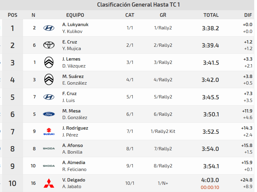 Quien las perdió todas fue Sergio Fuentes. El oficial de Škoda Canarias tuvo un toque en los metros iniciales de este TC-1. El impacto dañó la rueda trasera izquierda del Fabia RS Rally2 de forma considerable. Con esta apuntando hacia otro lado, no le quedó otro remedio que el de apartarse y retirarse. Entre los que permanecen en carrera, Yeray Lemes ocupa el tercer puesto. El conejero, a bordo de su Citroën C3 Rally2, cedió 3.3″ con el de Hyundai Canarias.
