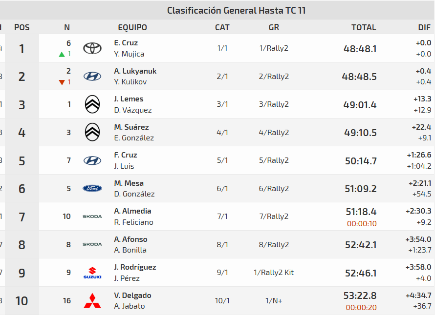 Fernando Cruz continúa con su sólida actuación a bordo del segundo Hyundai i20 N Rally2. Su objetivo, el de consolidar su quinto puesto, lo está cumpliendo con creces. A su espalda, Manolo Mesa mantiene a raya a Ayoze Almeida. El del Ford Fiesta Rally2 goza de una renta de 9.1″ sobre el palmero del Škoda Fabia RS Rally2, que ha visto sus opciones de acceder al top seis perjudicadas por la penalización que tuvo en el TC-9, en el que hizo salida en falso.