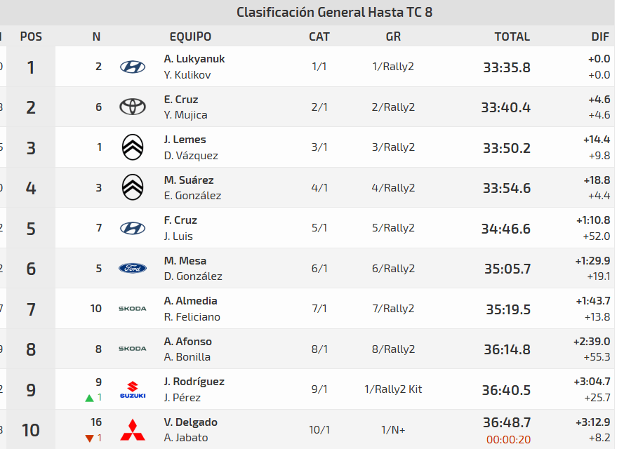 El ocho veces campeón regional, que aprovechó el paso por la asistencia para pulir algunos detalles en la configuración de su Toyota GR Yaris Rally2, por fin ha conseguido lo que tanto buscaba. Hasta el TC-8 tuvo que esperar, pero a tiempo de poner en apuros a su antecesor. Yeray Lemes también se acerca al hombre del i20 N Rally2 Step 2, aunque el de Tao todavía está a 9.8″ de Cruz. El que empieza a descolgarse de la zona de privilegio es Miguel Suárez.