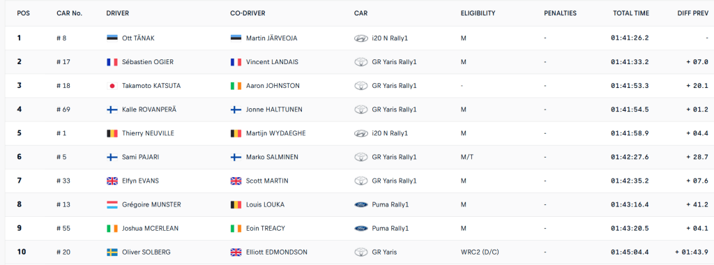 El piloto estonio finaliza el viernes de la prueba portuguesa con su Hyundai i20 N Rally1 instalado en la primera plaza de la clasificación general. Tras realizar alrededor de 150 kilómetros cronometrados, el #8 ostenta una ventaja de 7.0″ sobre Sébastien Ogier. Su compañero francés abandona por una rotura de suspensión cuando marchaba segundo.