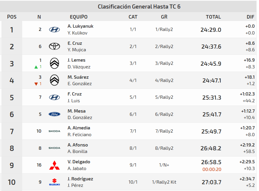 Ayoze Almeida, séptimo, vuelve a lucir una sonrisa con su cambio al Škoda Fabia RS Rally2: «Estoy muy contento, voy supercómodo con el coche. No quiero que el día se acabe». En P8 marcha Alejandro Afonso, quien ya pudo confirmar que su Škoda Fabia R5 funciona a pleno rendimiento tras los problemas de potencia que sufrió ayer. Víctor Delgado permanece en el noveno sitio, mientras Jorge Rodríguez es décimo sobre su reparado Suzuki Swift Rally2-Kit.