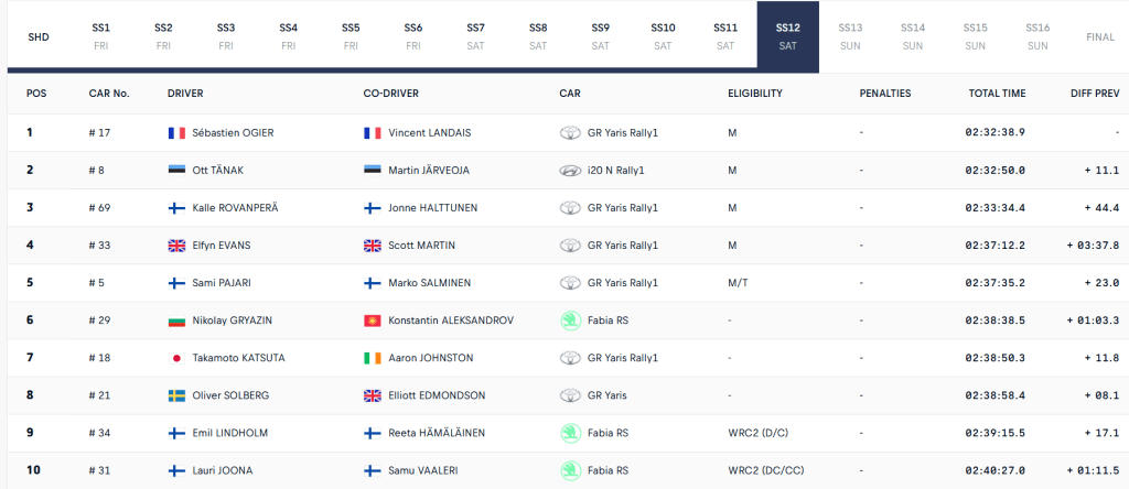 Sami Pajari, penalizado por dos pinchazos, aparece en el quinto lugar con el Toyota GR Yaris Rally1. Takamoto Katsuta, otro de los que tuvo que parar a cambiar neumáticos dañados, es séptimo de la general. El japonés está justo por detrás de Nikolay Gryazin, el más rápido del grupo de vehículos Rally2. Neuville, reenganchado, aprovechó el día para probar cosas en el Hyundai, al igual que hicieron Grégoire Munster y Joshua McErlean en los Ford Puma Rally1.