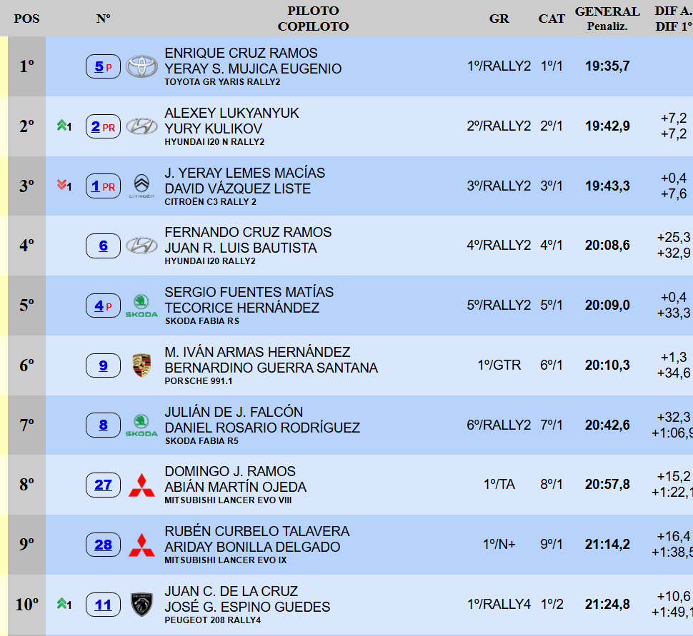 Iván Armas, que volvió a retocar la suspensión de su Porsche 991.1 GT3, permanece sexto, a solo 1.3″ del de Candelaria. Más descolgado está Julián Falcón. El del Škoda Fabia R5, sin el feeling para atacar debido al poco nivel de agarre que está encontrando, tiene un margen de 15.2″ con el Mitsubishi Lancer Evo IX de Domingo Ramos. El reaparecido Rubén Curbelo anda en P9 y Juan Carlos de la Cruz completa el top diez a bordo de su Peugeot 208 Rally4.