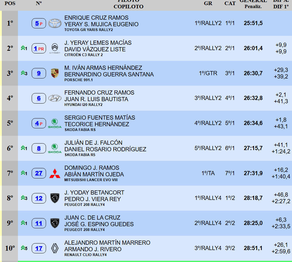 El compañero de Lukyanuk, aunque aparezca cuarto de la general, está tercero a efectos de puntos para el certamen regional. El menor de los Cruz ha apostado por montar neumáticos nuevos solo en el tren delantero de su Hyundai. El de Candelaria subió el ritmo con el Škoda Fabia RS Rally2, pero recibió bandera roja en el lugar del accidente de Alexey. Julián Falcón anda en sexta plaza, seguido de Domingo Ramos, Yoday Betancort y Juan Carlos de la Cruz.