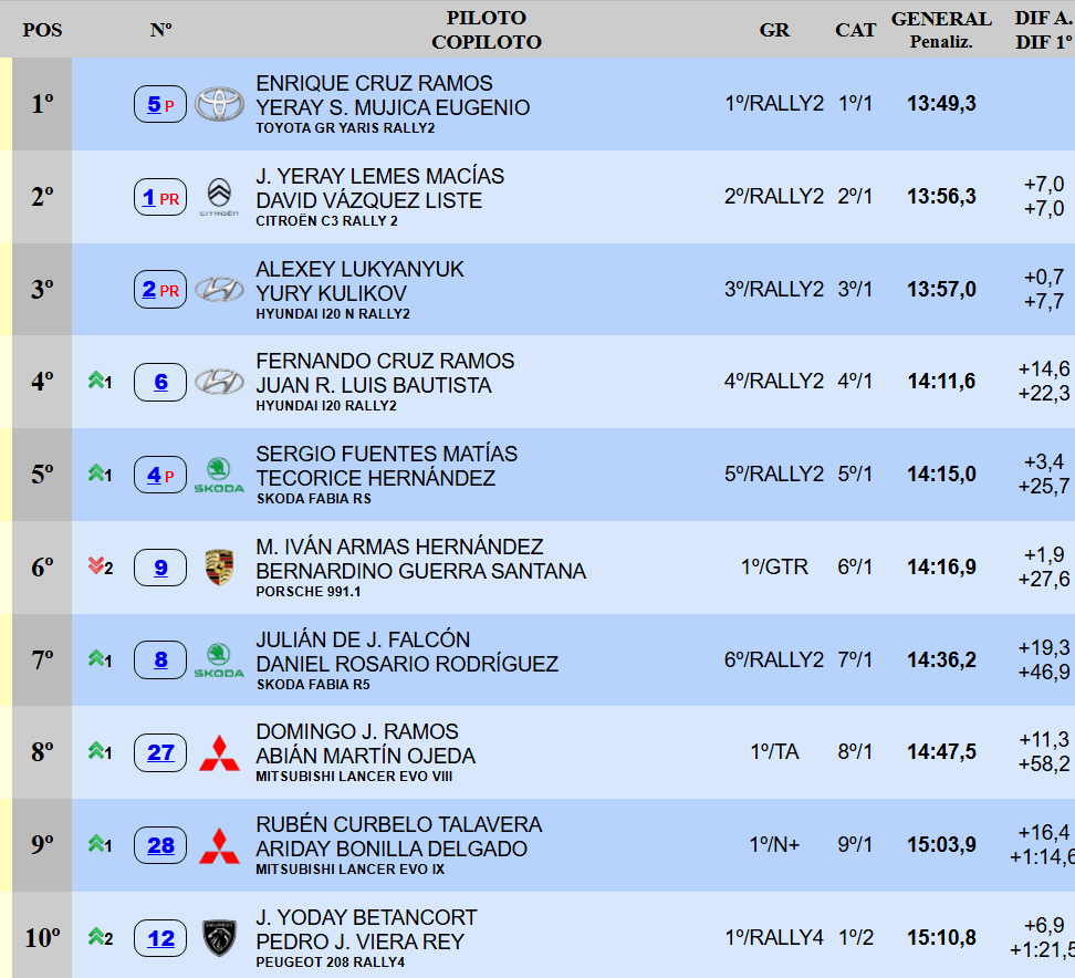 Fernando Cruz, por su lado, ha conseguido ascender a la cuarta. El del Hyundai i20 N Rally2 comentó que los frenos no funcionaron de la forma correcta. Sergio Fuentes es quinto a los mandos del Škoda Fabia RS Rally2 oficial. El de Candelaria golpeó una piedra que encontró a mitad de la carretera y desconoce si tiene algún componente roto. Detrás de Armas, el top diez lo cierran Julián Falcón, Mingo Ramos, Rubén Curbelo y Yoday Betancort, en ese orden.