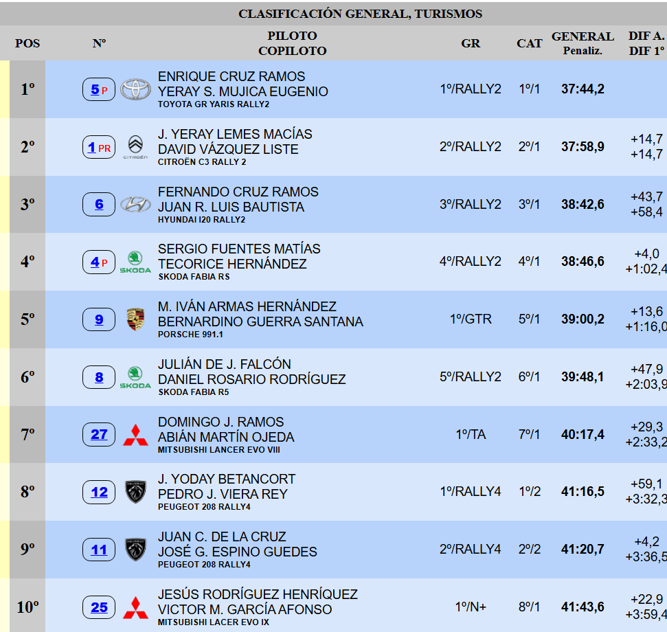 Quinto marcha Iván Armas, que ha sufrido lo indecible para encontrar agarre con las ruedas usadas que decidió poner a su Porsche 991.1 GT3. Justo a su espalda aparece Julián Falcón con su Škoda Fabia R5. Domingo Ramos permanece séptimo a los mandos de su Mitsubishi Lancer Evo VIII, mientras el octavo lugar está en las manos de Yoday Betancort, el líder de la Rally4 Cup Canarias. Noveno figura Juan Carlos de la Cruz y en décimo, Jesús Rodríguez.