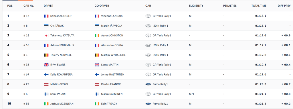 Thierry Neuville tiene su Hyundai en la quinta plaza, mientras Elfyn Evans y Kalle Rovanperä comparten la sexta con sendas unidades del Toyota GR Yaris Rally1. Al galés, que repite con la responsabilidad de abrir carretera, asume que deberá de atacar en la jornada de mañana, aunque sin olvidarse de la gestión de la mecánica. Martins Sesks es el mejor representante del M-Sport Ford desde su octavo puesto. El top diez lo cierran Sami Pajari y Josh McErlean.