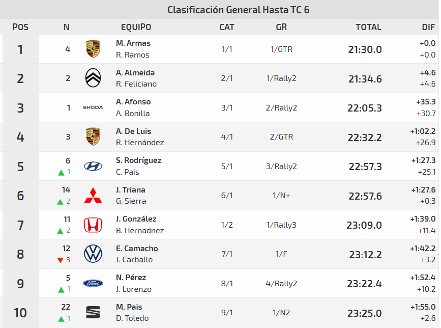 Aníbal de Luis aguantó el cuarto puesto al que tantos deportistas aspiraban al comienzo del día. El del Porsche 997 GT3 Cup Rallye rodó en tierra de nadie, con diferencias establecidas por delante y también a su espalda. El top five lo completó Samuel Rodríguez al volante del Hyundai i20 N Rally2. Ante los suyos, experimentó una progresión continua que le permitió rebasar en las postrimerías del evento a Édgar Camacho, que cayó del quinto al octavo sitio.