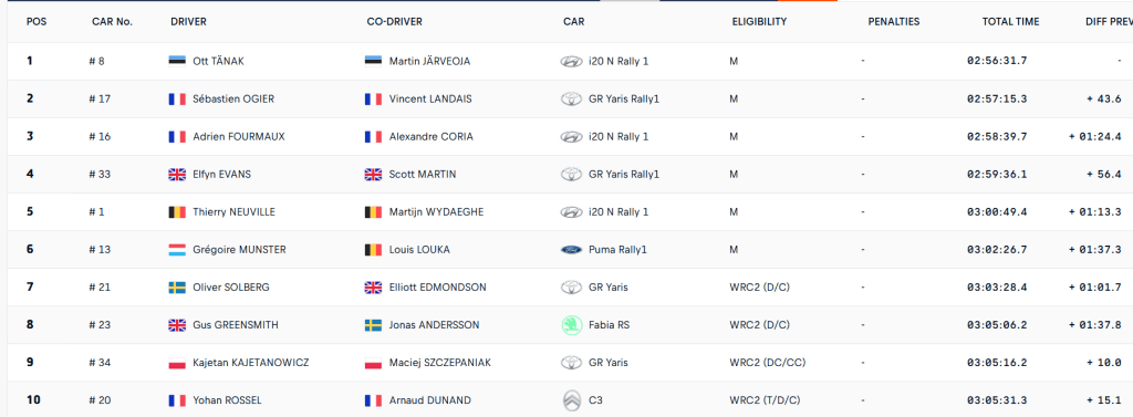 El piloto estonio gana las tres especiales de la sección de la tarde y cierra la jornada con una renta de 43.6″ sobre Sébastien Ogier. Su Hyundai i20 N Rally1 exhibe la resistencia mecánica que le negó la victoria en Portugal. La firma nipona, por el contrario, pierde a Kalle Rovanperä por un problema de frenos y a Takamoto Katsuta con una salida de vía.