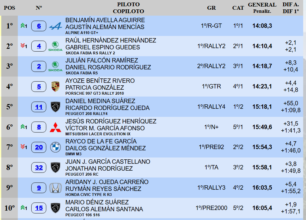 Tras la retirada de Raúl Quesada en el último enlace de anoche, el quinto sitio es propiedad de Daniel Medina. El del Peugeot 208 Rally4, uno de los numerosos pilotos que compite en casa este fin de semana, aparece justo por delante de un Jesús Rodríguez que ya ha subido siete posiciones con su Mitsubishi Lancer Evo IX. El top diez lo cierran Rayco de la Fe (BMW M3), Aridany Ojeda (Honda Civic Type-R R3) y Mario Déniz (Peugeot 106 S16), en ese orden.