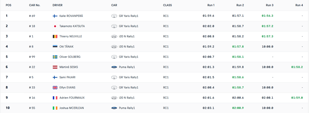 Martins Sesks lideró la nómina de representantes de M-Sport Ford desde el sexto puesto. El letón, mucho más cómodo por estas latitudes y con el respaldo de sus paisanos, que se han desplazado en masa hasta la localidad de Tartu, terminó justo por delante de Sami Pajari y del citado Evans. Adrien Fourmaux, el más activo con cuatro pasadas, fue noveno, mientras Josh McErlean y Grégoire Munster se encargaron de cerrar el top once con sus Puma Rally1.