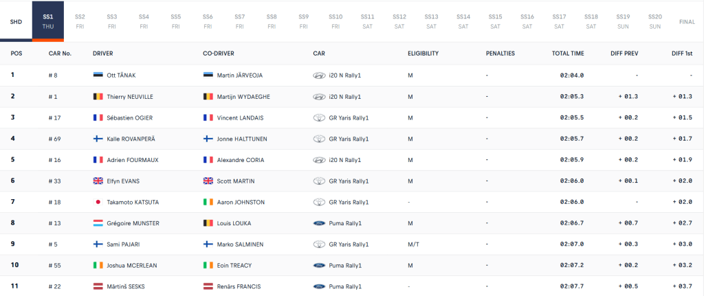 Takamoto Katsuta, el más rápido en el Shakedown, ha situado su Toyota en el séptimo lugar e igualado a la décima con el #33. El japones quiere cuajar un buen papel en un evento que conoce tanto o más que el de su nación. Grégoire Munster encabeza la nómina de hombres del M-Sport Ford desde el octavo puesto. Sami Pajari figura noveno, por delante de Joshua McErlean. Martins Sesks, undécimo, completa el grupo de seguidores de la primera división.