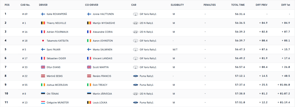 El bicampeón del mundo concluye la jornada del viernes con una ventaja de 4.9″ sobre Thierry Neuville. La igualdad impera en la zona alta de la clasificación, con el top cuatro agrupado en menos de una decena de segundos. Tercero marcha Adrien Fourmaux. Ott Tänak choca contra un árbol y cede un tiempo valioso que le hace descender hasta P10.
