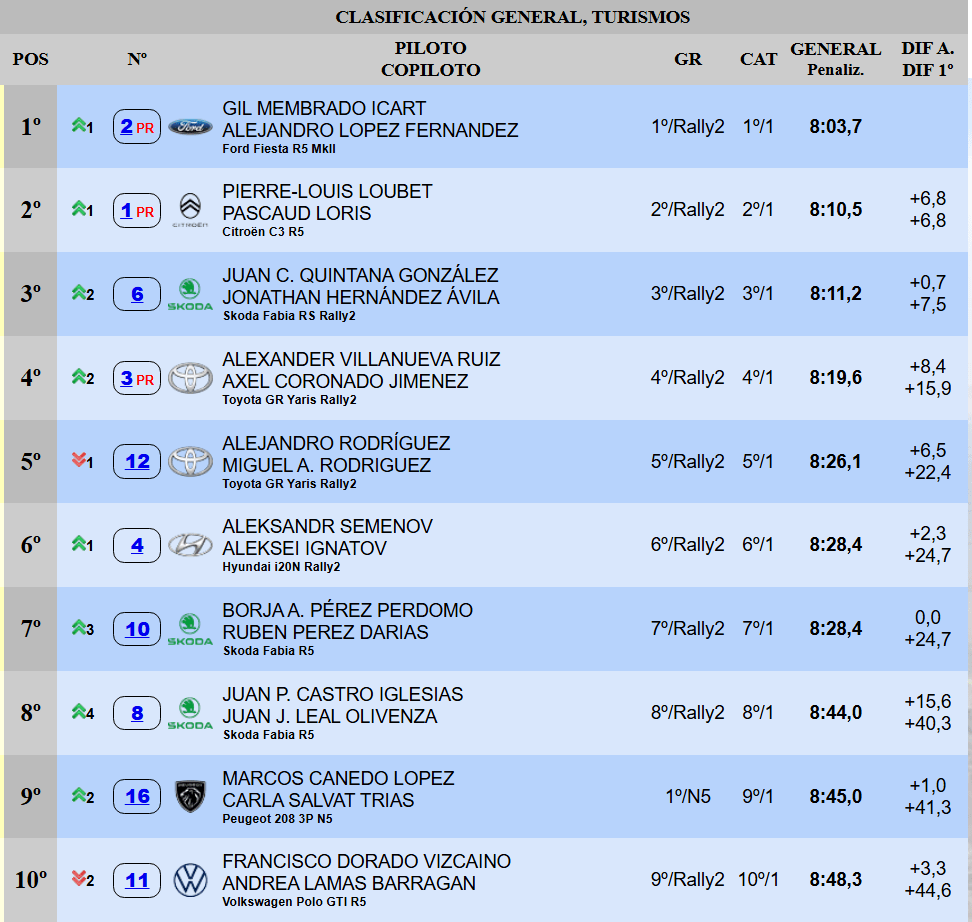 El top cinco provisional lo cierra Alejandro Rodríguez con otro Toyota GR Yaris Rally2. Sexto marcha un Aleksandr Semenov obligado a reaccionar al despertar de Membrado, su rival en la puja por el trono español. Borja Pérez ha logrado escalar al séptimo puesto con su Škoda Fabia R5, seguido por Juan Pablo Castro (Škoda Fabia R5), Marcos Canedo (Peugeot 208 3P N5) y Francisco Dorado (VW Polo GTI R5). Este último pinchó una rueda en una alcantarilla.