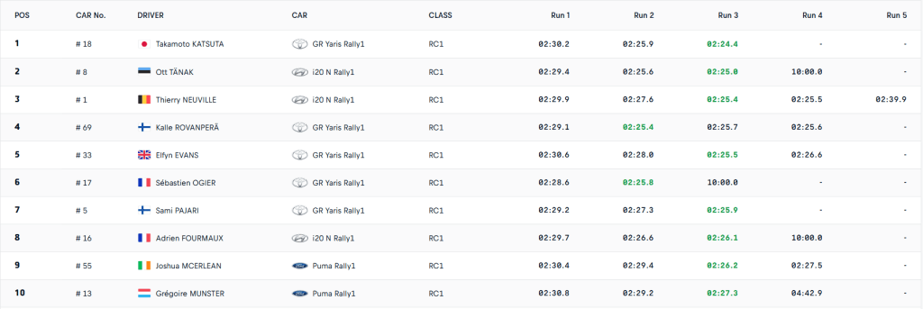 Kalle Rovanperä, el reciente ganador del ‘1000 Lagos’, se instaló en la cuarta plaza. Evans y Ogier completaron el top seis. Sami Pajari, con su GR Yaris Rally1 vestido de negro -al igual que los de sus vecinos en las carpas de la escuadra nipona-, terminó séptimo, justo delante del francés Adrien Fourmaux. Josh McErlean condujo su Ford Puma Rally1 hasta el noveno puesto. Grégoire Munster, con algo de trabajo con los amortiguadores de su coche, fue P10.