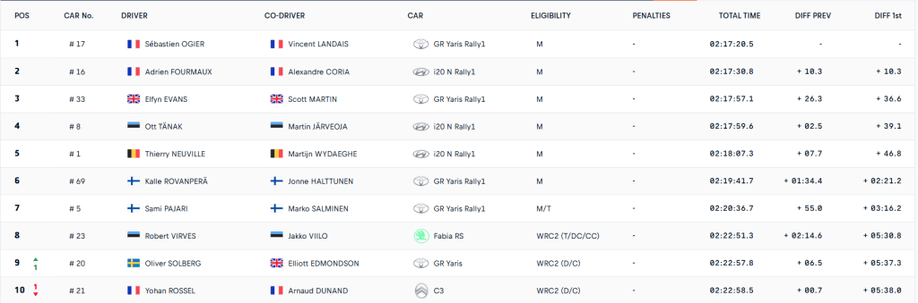 En WRC2, Oliver Solberg es el protagonista de otra remontada de aúpa. El sueco del Toyota GR Yaris Rally2 ya ha dado caza de su máximo contrincante en la batalla por el entorchado de WRC2, Yohan Rossel. El oficial de Citroën Racing baja al tercer sitio después de pasar un día complicado por la falta de agarre que siente sobre su C3 Rally2. El ganador absoluto del Rally de Estonia es segundo, a 6.5″ de Robert Virves y su Škoda Fabia RS Rally2 semioficial.