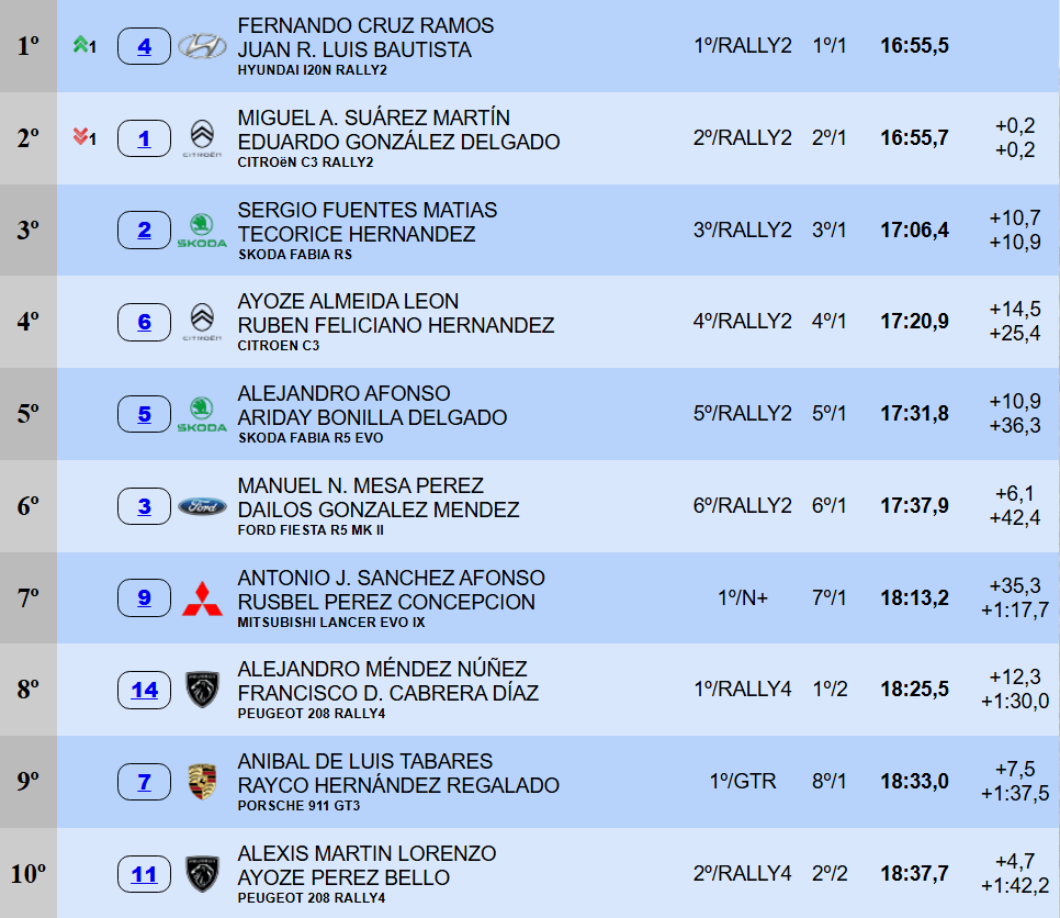 Ayoze Almeida marcha en el cuarto lugar, justo por delante de su rival directo en la puja por el entorchado del Insular de La Palma de Rallies, Alejandro Afonso. La diferencia entre ellos es de 10.9″. Manolo Mesa, armado con el Ford Fiesta Rally2 del Copi Sport, figura en P6. El top diez lo completan Antonio Jesús Sánchez (Mitsubishi Lancer Evo IX), Alejandro Méndez (Peugeot 208 Rally4), Aníbal de Luis (Porsche 911 GT3) y Alexis Martín (Peugeot 208 Rall4).
