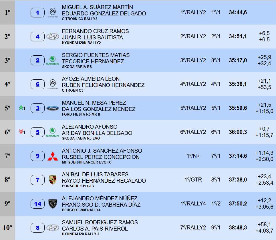 El de Los Llanos de Aridane recupera el liderato que había cedido en el último tramo de la jornada del viernes. A los mandos de su Citroën C3 Rally2, finaliza la mañana con una ventaja de 6.5″ sobre un Fernando Cruz que no da su brazo a torcer. Sergio Fuentes, sin el ritmo de otras ocasiones, permanece en la tercera plaza, pero muy lejos de la cabeza.