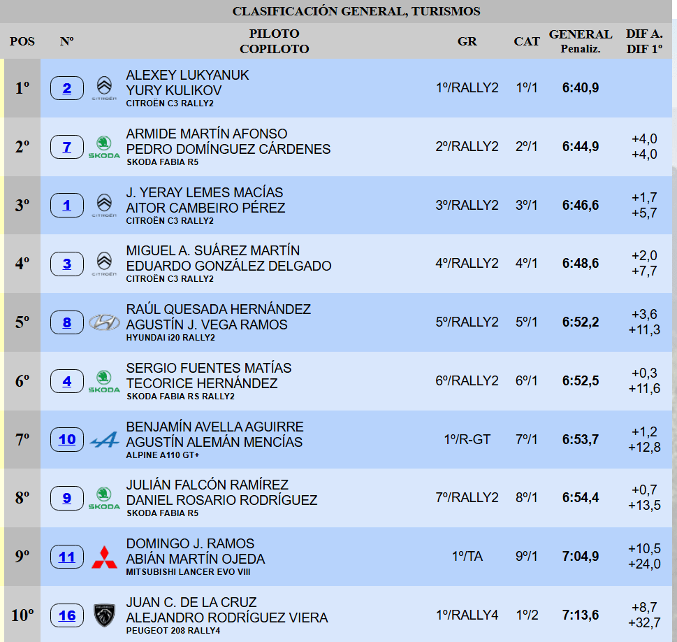 A pesar de auparse al liderato de la séptima prueba del Campeonato de Canarias de Rallies sobre Asfalto (CCRA), Lukyanuk avisó de que todavía ha de «tomarse un tiempo» para rodar encontrar «el feeling» con el artefacto de la firma francesa, que lo notó algo «blando». Justo por detrás de la estrella internacional figura Armide Martín. El del Škoda Fabia R5 encabeza la armada canaria: «Hemos ido tranquilitos, es el primer tramo del día», dijo en control stop.