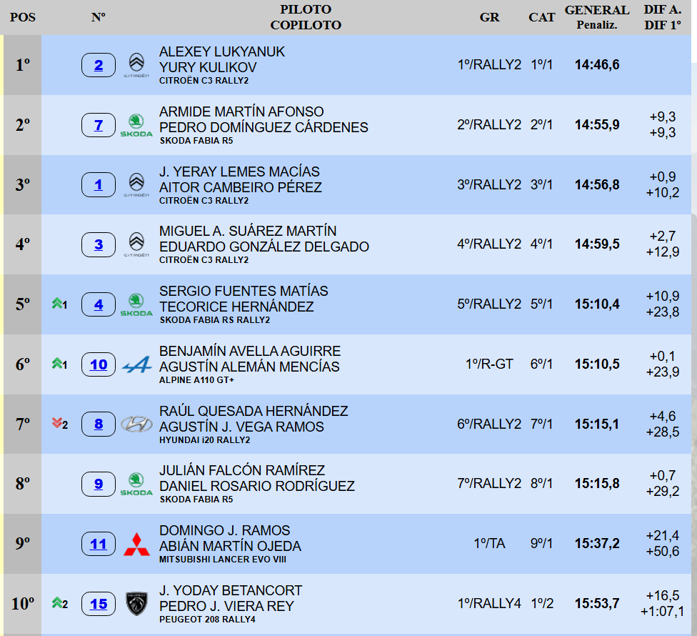 Benjamín Avella, a pesar de su incomodidad al volante del Alpine A110 GT+, ha ascendido a la sexta plaza. «Tenemos que trabajar bastante con el coche para ponerlo a punto», admitió el grancanario. El que ha perdido dos posiciones ha sido Raúl Quesada, séptimo. El Hyundai i20 R5 experimentó algún exceso de temperatura, pero sin comprometer su rendimiento. El top diez lo completan Julián Falcón, Domingo Ramos y José Yoday Betancort, en ese orden.