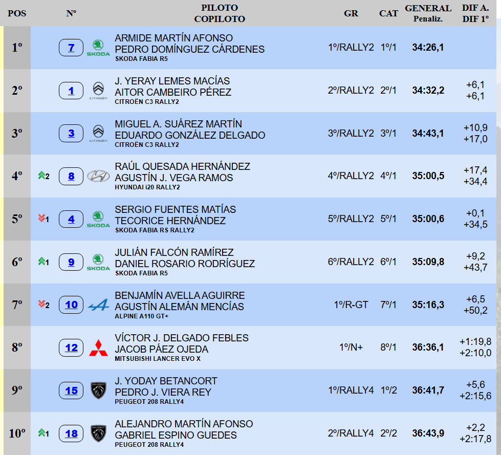 El palmero mantiene su tercera posición y dispone de una ventaja de 17.4″ respecto a Raúl Quesada y su Hyundai i20 R5. El de Valleseco, ahora con un compuesto de neumático más adecuado que el que montó en la sección de la mañana, disfruta de un alto nivel de confort con los reglajes que ha confeccionado para su artefacto. Una configuración que, incluso, le ha permitido superar a Fuentes. El de Candelaria marcha quinto, pero a solo 0.1″ de esa P4.