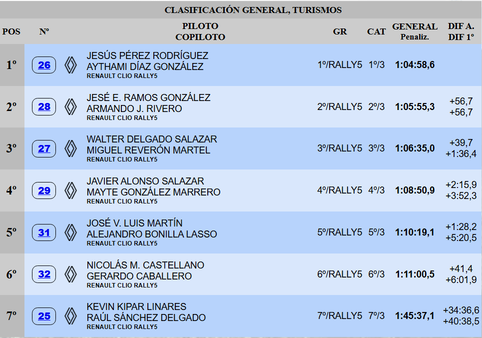 Jesé acabó con el susto de un pinchazo, aunque eso no comprometió su segundo puesto. El cuadro de honor lo cerró Walter Delgado, que mantiene así la regularidad en su campaña de debut a los mandos del Rally5 de la marca francesa. Javier Alonso concluyó en una solitaria cuarta plaza, mientras que el veterano José Vicente Luis se encargó de completar el top five del evento organizado por la Escudería Aterura. El sexto sitio se lo anotó Nicolás Castellano.