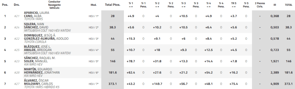 José Luis Blázquez, a los mandos de otra unidad Mitsubishi Colt 160 HEV Kaiteki, figura por la cuarta posición provisional. Once puntos le separan de la zona de podio. Mucho más lejos aparece Raquel Sánchez, que ha perdido gran parte de sus opciones en la lucha por la plata nacional. La del KIA Niro HEV inició el fin de semana con una fuerte sanción de la que no le resultará sencillo reponerse. Eduardo Martín y Óscar Álvarez, en ese orden, cierran la tabla.