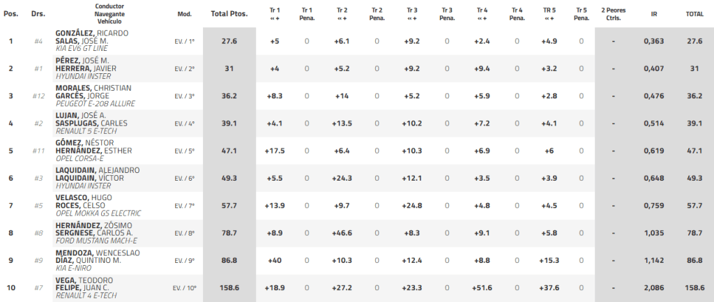 Laquidain figura en el sexto lugar después de sufrir una fuerte penalización en el TR2. Antes de recibirla marchaba cerca del primer sitio. Hugo Velasco, equipado con el Opel Mokka GS Electric, es séptimo, mientras que Zósimo Hernández ocupa la octava plaza al volante de un Ford Mustang Mach-E inscrito por Copi Sport. Los grancanarios Wenceslao Mendoza (KIA e-Niro) y Teodoro Vega (Renault 4 E-Tech) van en novena y décima posición, respectivamente.