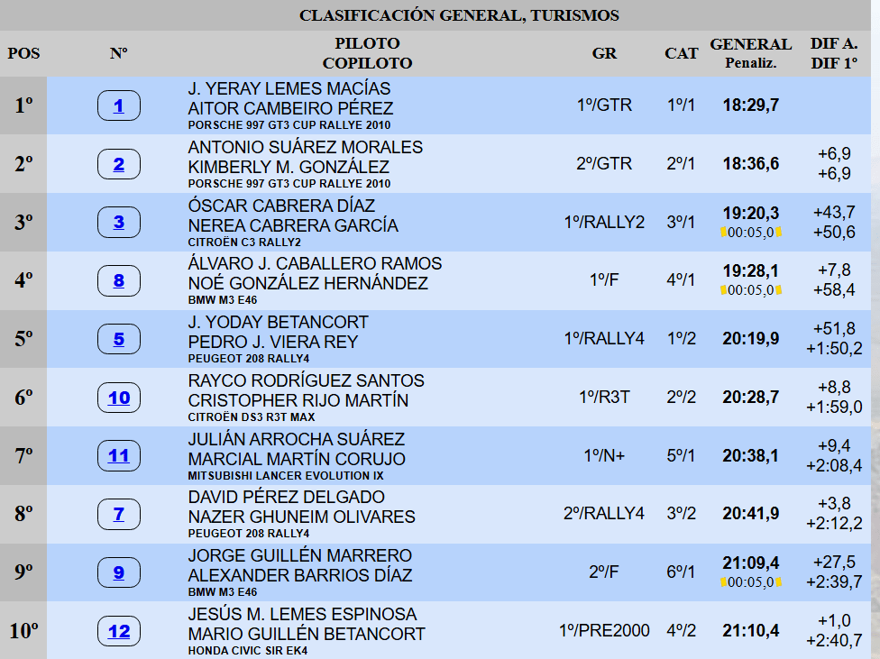 Óscar Cabrera mantiene el tercer lugar. El del Citroën C3 Rally2, con unas sensaciones más propicias para atacar, continúa por delante de un Álvaro Caballero que todavía amenaza con quitarle su sitio en la zona de privilegio. El del BMW M3 E46 está a 7.8″ de su predecesor. El top cinco provisional lo cierra Yoday Betancort con su Peugeot 208 Rally4. El joven conejero está centrado en llegar a la meta sin incidencias tras el abandono de Juan Carlos de la Cruz.