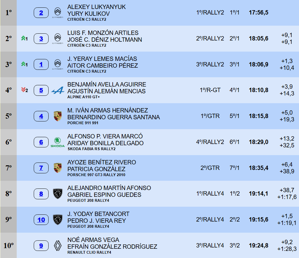 El piloto de Lanzarote recupera la tercera posición en la última prueba del Campeonato de Canarias de Rallies de Asfalto (CCRA) y se ubica en una zona que permitiría ejecutar esas órdenes de equipo previstas con Alexey Lukyanuk. Luis Monzón, que no puntúa ni bloquea en el certamen regional, asciende al segundo lugar a pesar de algún problema.