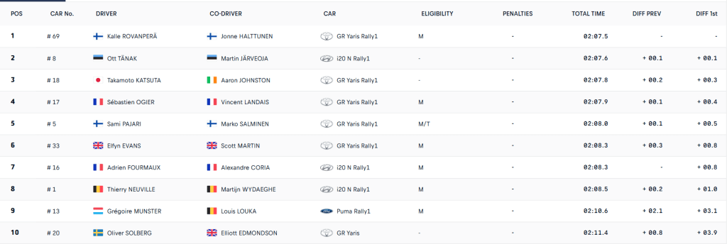 Takamoto Katsuta ha instalado su Toyota GR Yaris Rally1 en el tercer puesto. El héroe local, otro de los que no encontró mucho confort en las complejidades del TC-1, cedió 0.3 ante el autor de la marca de referencia. La igualdad fue máxima en la categoría reina, ya que el top ocho anda envuelto en un margen de un segundo. Dentro del grupo figuran Sébastien Ogier, Sami Pajari, Adrien Fourmaux, Elfyn Evans y Thierry Neuville, los cinco en ese mismo orden.