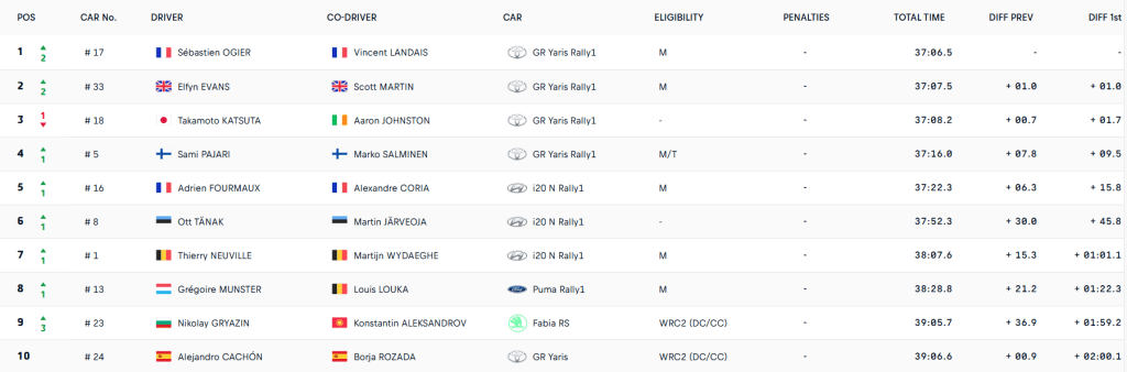 El ocho veces campeón del mundo concluye el bucle matinal de la etapa del viernes con un liderato de 1.0″ sobre su rival directo en la pelea por el título, Elfyn Evans. Takamoto Katsuta completa el podio provisional a solo 1.7″ del francés. El finlandés, por su parte, está hundido en la clasificación tras dañar la suspensión trasera izquierda en una valla.
