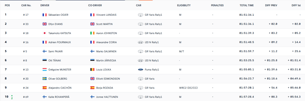 El piloto galés recorta distancias con su compañero de equipo y gran rival en la puja por el título del FIA World Rally Championship (WRC). Le gana en las tres tramos del bucle matinal y, además, supera al local Takamoto Katsuta en la clasificación general. Adrien Fourmaux sorprende con su ritmo al volante de un Hyundai con el que sella dos scratch.