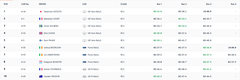Oliver Solberg, que afronta una campaña completa en la categoría reina, se situó en tercera posición, una por delante del galés Elfyn Evans. El 1-2-3-4-5 nipón lo cerró Sami Pajari. Por parte de M-Sport, Josh McErlean se impuso a su compatriota Jon Armstrong por un margen de medio segundo. El #55, con la responsabilidad de liderar a la formación británica, acabó sexto de la clasificación combinada. Grégoire Munster dirigió su unidad hasta el octavo sitio.