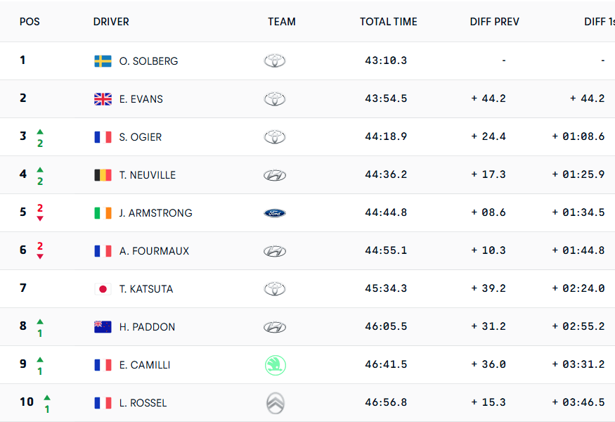 En WRC2, el reestreno de Lancia no está saliendo como los italianos habrían deseado. En el TC1, el local Yohan Rossel tomó el camino de la retirada tras tocar un muro de piedra con la rueda delantera derecha de su Ypsilon Rally2 HF Integrale. Posteriormente, Nikolay Gryazin cedió la batuta de mando al dañar la suspensión del suyo contra un árbol. El ruso, al menos, continúa en carrera a 42.0″ de Eric Camilli, que va al frente sobre un Škoda Fabia RS Rally2.