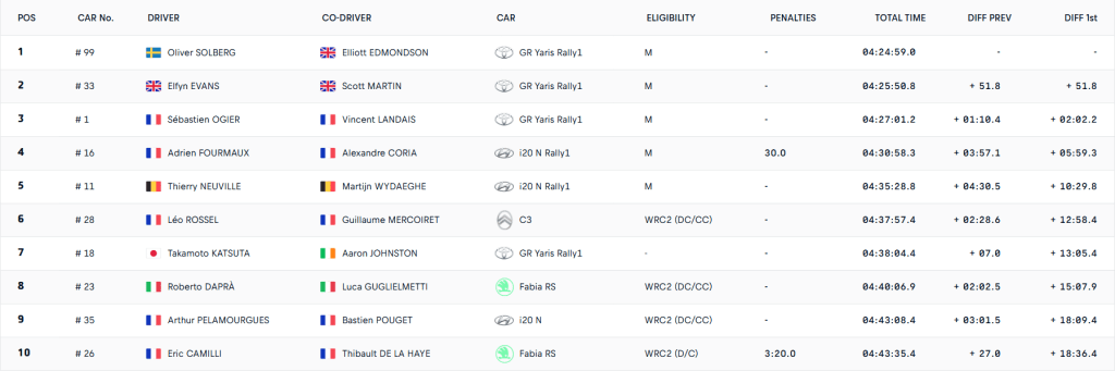 La lucha por la segunda posición se resolvió en favor de Elfyn Evans. El británico se embolsó los cinco puntos correspondientes al scratch en el tramo de bonificación y selló otros cuatro en un Super Sunday que conquistó Yohan Rossel en el Lancia Ypsilon Rally2 HF Integrale. El galés se quitó el sombrero con el rendimiento de su nuevo compañero, al igual que Ogier. El ídolo local tuvo que contentarse con el tercer lugar al carecer de regularidad en su GR Yaris.