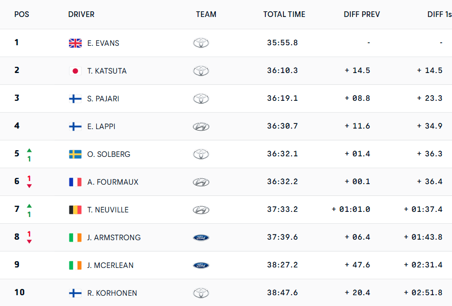 Esapekka Lappi, incómodo por el escaso nivel de agarre que siente, figura cuarto. De vuelta al Hyundai Shell Mobis WRT, el #4 encabeza un grupo en el que aparecen el citado Solberg y Adrien Fourmaux. Thierry Neuville marcha séptimo, aunque a un minuto de su predecesor. El belga declaró que atraviesa el momento «más duro» de su carrera. Jon Armstrong y Josh McErlean le persiguen. Martisns Sesks, penalizado por tres pinchazos, está fuera del top 20.