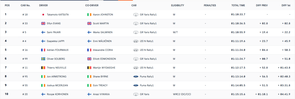 El piloto japonés vuela en la sección de la tarde y arrebata el primer lugar de la general a su compañero Elfyn Evans. Ambos empezarán la jornada del sábado envueltos en una brecha de menos de tres segundos. El tercer puesto la ocupa Sami Pajari sobre otro GR Yaris Rally1. Thierry Neuville obtiene el primer scratch del fin de semana para Hyundai.