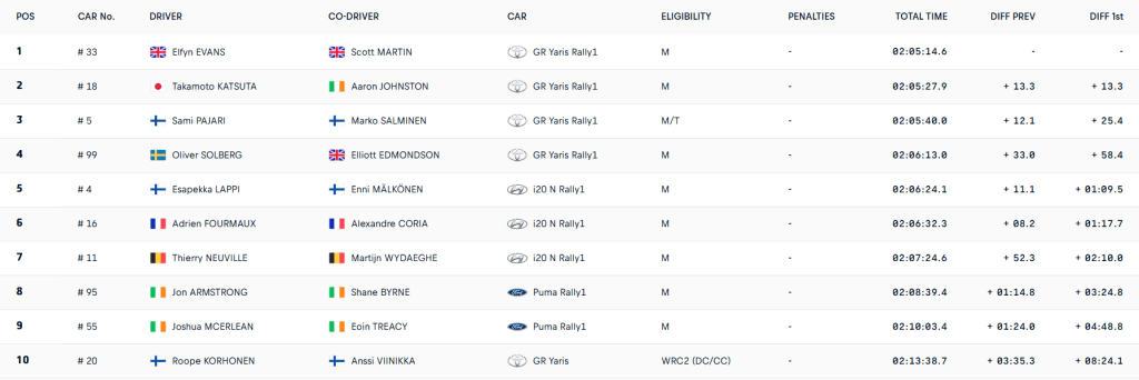 Adrien Fourmaux, sexto, también apostó por modificaciones en los reglajes de su coche. Los amortiguadores, que los había señalado como el motivo de la falta de rendimiento, los soltó tanto como fue posible. No era el movimiento más confortable para su espalda, pero sí para engranar una marcha más y rodar a la altura de los Toyota. Thierry Neuville, séptimo, volvió a establecer un mejor tiempo. Jon Armstrong y Josh McErlean, mientras, figuran en P8 y P9.