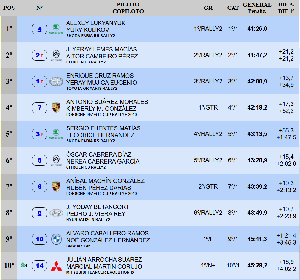 Sergio Fuentes aseguró el quinto lugar después de mantener durante toda el día un intenso duelo contra el local Óscar Cabrera. El del Škoda Fabia RS Rally2, a efectos del CCRA, suma el botín correspondiente a una P4. Aníbal Machín saldó su estreno a bordo del Porsche 997 GT3 Cup Rallye 2010 con un séptimo puesto de la general y segundo dentro del TCRA. En el octavo sitio finalizó el joven Yoday Betancort, uno de los nuevos representantes de Hyundai.