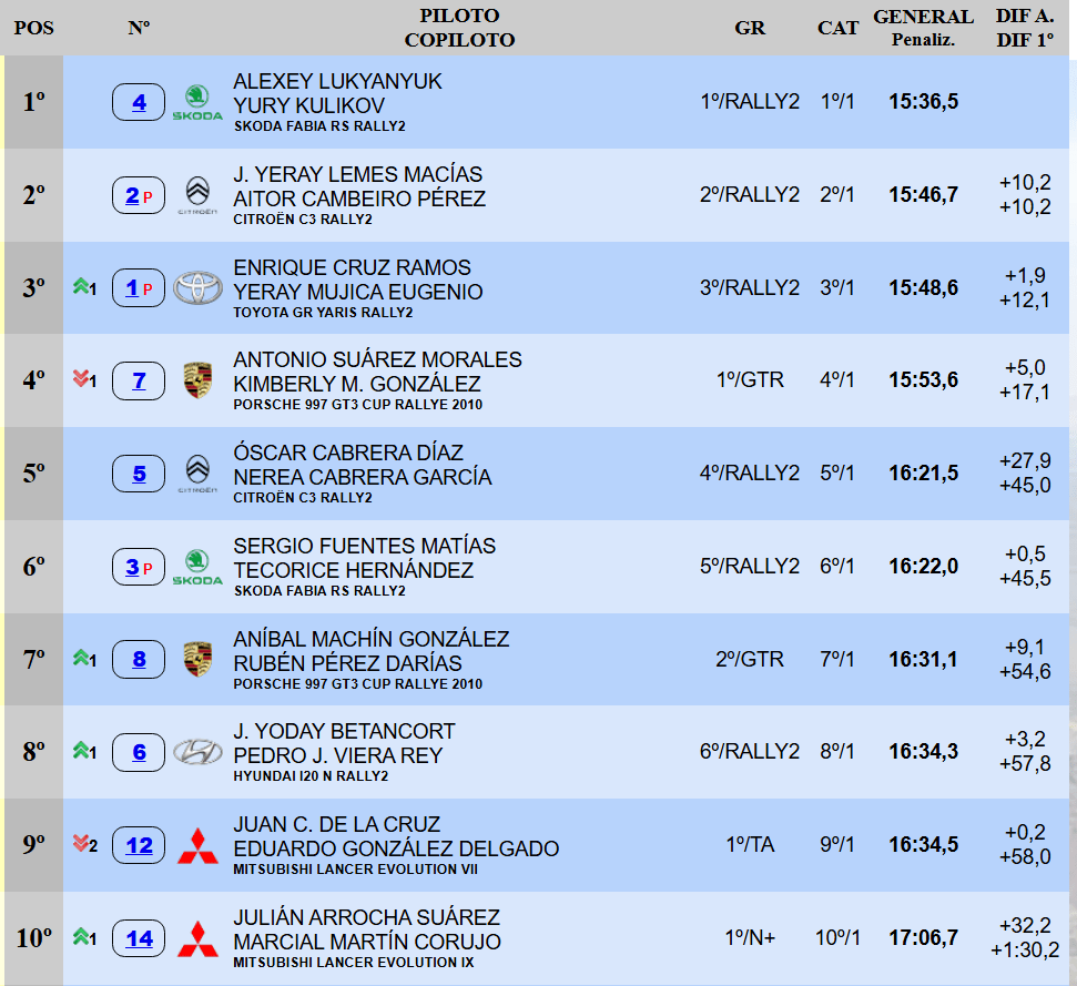 Suárez, que intentará responder a los Rally2 en ‘La Candelaria-San Bartolomé’, lamentó que se encontró el asfalto en malas condiciones: «Está bastante sucio, lo hemos hecho lo mejor posible». Al del Porsche 997 GT3 Cup Rallye 2010 le cayeron 7.9″ con respecto a Lukyanuk. Por detrás del deportista de La Geria continúa Óscar Cabrera. El del Citroën C3 Rally2 sigue con unas vibraciones que merman su confianza a la hora de abordar las curvas más rápidas.