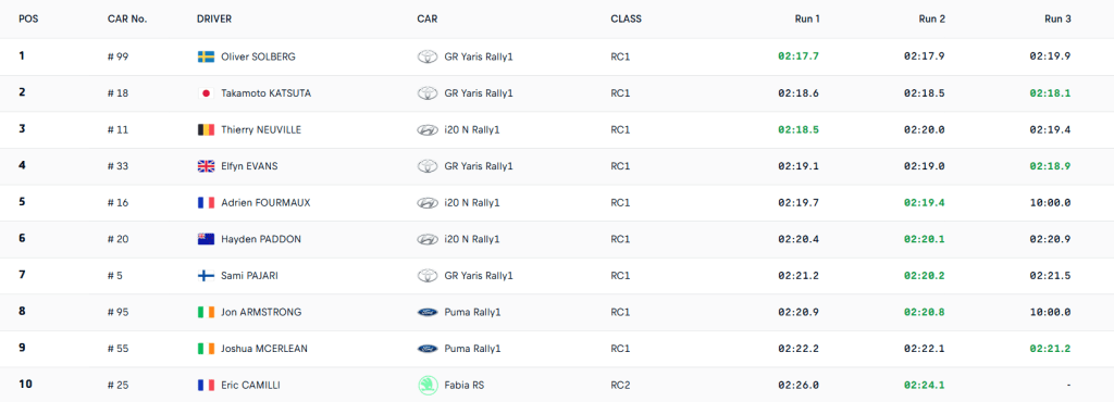 Hayden Paddon, más confiado con el artefacto surcoreano, se ubicó en el sexto sitio. El dos veces ganador del FIA European Rally Championship (ERC) sabe que mañana tendrá un día complejo al partir tan atrás: «Eso no nos vendrá muy bien, pero debemos pensar en el largo plazo», manifestó. Sami Pajari, que optó por un planteamiento conservador, acabó séptimo, justo por delante de los Ford Puma Rally1 semioficiales de Jon Armstrong y Josh McErlean.