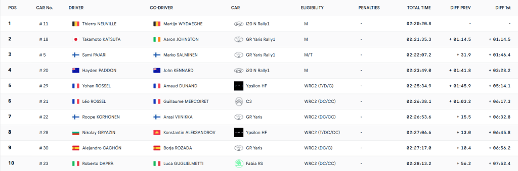 La alegría de Neuville contrasta con la frustración de Adrien Fourmaux. El francés chocó con su Hyundai i20 N Rally1 contra un poste de cemento. Este golpe arrancó una rueda de cuajo y le abocó al abandono. Hayden Paddon sí continúa en carrera para los de Alzenau. Ubicado en el cuarto lugar, el deportista neozelandés no duda sobre su objetivo. «Mejorar el ritmo es algo secundario en este momento, ya que necesitamos traer estos puntos a casa», asegura.