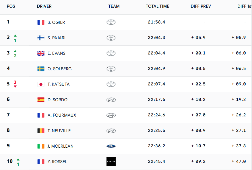 Por lo que respecta a Hyundai, Dani Sordo continúa por delante de sus dos compañeros. El cántabro no está acusando su inactividad en la categoría reina ni muestra preocupación por los problemas de los demás: «No es asunto mío ver qué andan haciendo». Adrien Fourmaux y Thierry Neuville, que se encuentran en P7 y P8, no encontraron la forma de seguir la línea de los Toyota. Por la parte de M-Sport Ford, Jon Armstrong libró por la mínima un accidente.