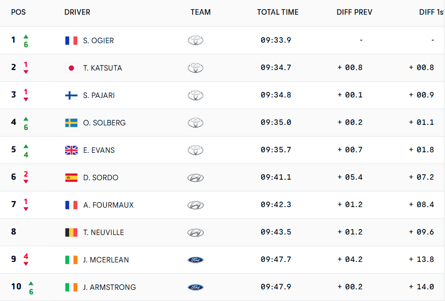 Los cinco abanderados del Toyota Gazoo Racing WRT están envueltos en 1.8″. «Va a ser una pelea intensa», vaticina Séb. El vigente campeón mundial ha arrebatado la batuta de mando a Takamoto Katsuta por ocho décimas de segundo. El japonés relató que es una experiencia bonita la de «ser el primer coche en la carretera», aunque aquí no le otorgue ventaja alguna. Sami Pajari ocupa la tercera posición de la general, seguido por Oliver Solberg y Elfyn Evans.