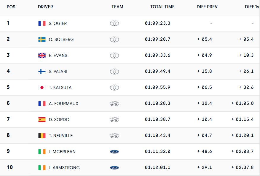 Entre los miembros del Hyundai Shell Mobis WRT sigue mandando Adrien Fourmaux. El #18 ha aplicado su experiencia del 2020, cuando ganó la ronda insular, para elevar su renta con Dani Sordo a dobles dígitos. El español no quería «acabar en los árboles» y, por ello, abordó con cautela la bajada final. Thierry Neuville, octavo, destacó la precisión de los datos que le aportaron sus ouvreur, aunque eso no le sirvió para firmar un crono a la altura de los Toyota.